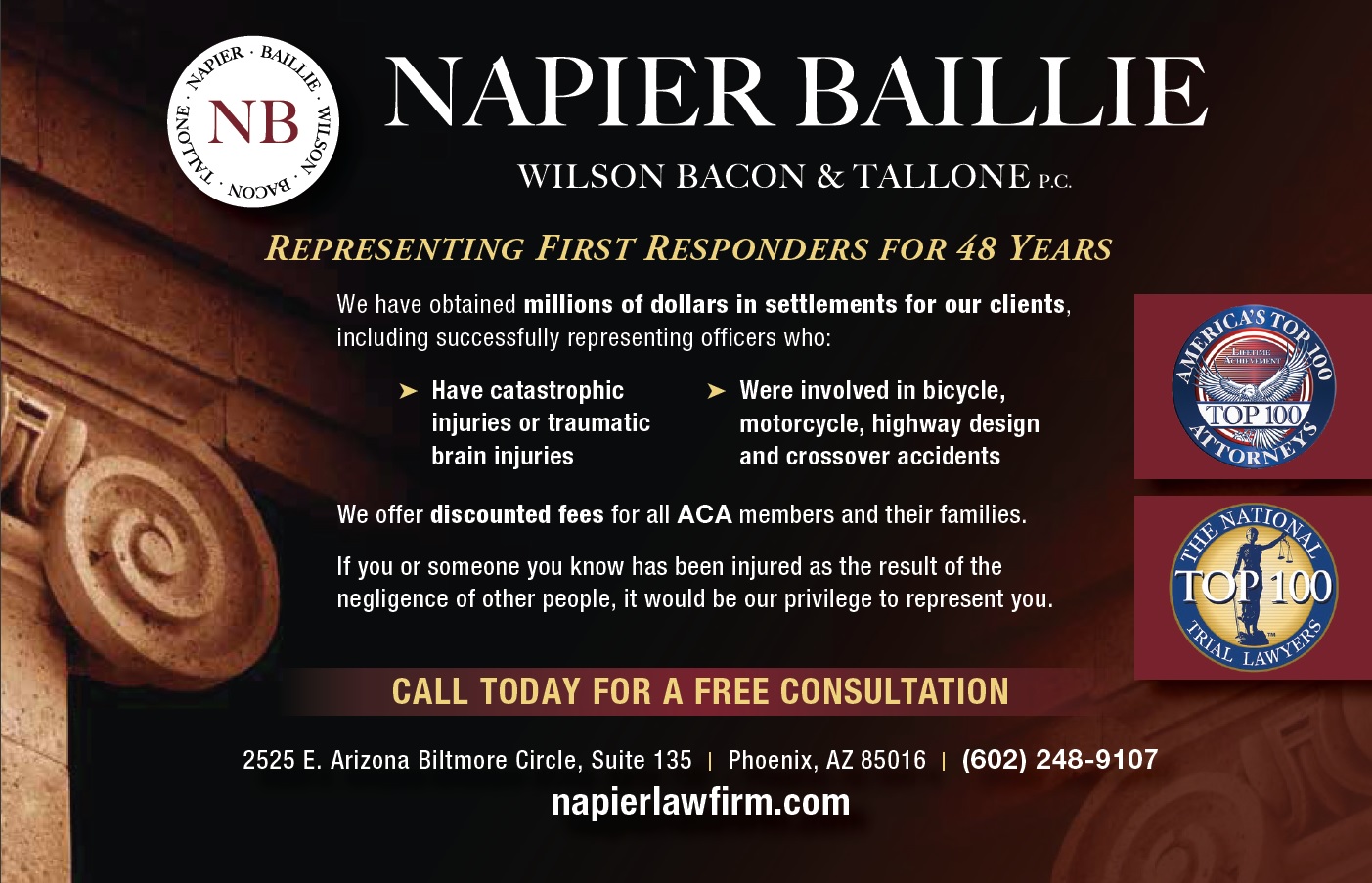 We provide the best criminal/civil legal coverage for job performance through PORAC and the best administrative legal assistance for 601s (admininstrative investigations) through the law firm of Napier, Baillie, Wilson Bacon & Tallone P.C.. The ACA is there for you.